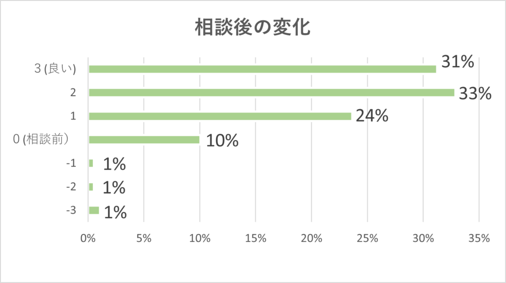 アンケート結果でプラス変化の1~3を回答した方の中には「内に留めていたモヤモヤを話すことで気持ちの整理ができた」、「解決したい悩みに対して具体的なアドバイスを得られた」など個人差がありますが、相談の場で解決に至らなくても前向きな気持ちを持ったコメントが見られました。